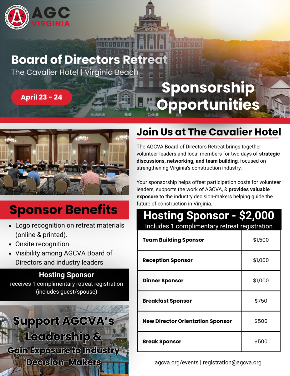 Or call: 757-425-8555 and refer to the AGCVA Board Retreat.